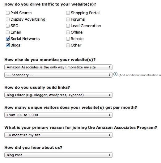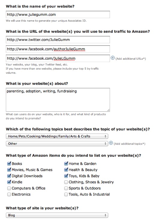 5. Tell Amazon about your website. This form is pretty self-explanatory and don’t worry. Most of the answers are just for their research purposes. (You can click on the images below to enlarge if you have questions.)