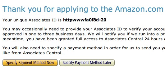 6. Next you’ll get a page with your unique Amazon ID. It’ll look weird like “httpwwwfa0f8d-XX”. Click the “Specify Payment Information” button.